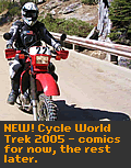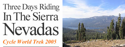 This year’s Trek came a couple of weeks earlier, in no small part because last year’s early blizzard ended up taking the lives of a couple of Japanese rock climbers. As one of about 50 invitees to join most of CW’s editorial, production, and sales staff, and admitedly probably the least experienced dirt rider of the bunch, I nontheless was selected to lead our merry band of adventurers, as we began Day One’s 141-mile meander through the Sierra National Forest that just brushed the extreme southern tip of Yosemite National Park. (I’m sure the thought process behind this went along the lines of, “If all of a sudden he’s not there any more, look out for the cliff.”) A little under eight hours later, we pulled into the Sierra Summit Lodge at nearly 8,000 feet altitude, happy to have survived, elated over the route, and thrilled that the open bar was running on all cylinders. Saturday, in a replay of last year, we again charged up to Mono Hot Springs. The Kaiser Pass Road – goat path is more like it – runs up and down through redwood forest and loose boulder fields, twisting and turning as it rises and falls several thousand feet over the course of 20-plus miles, before coming to a cul-de-sac. That afternoon, we went in search of Strawberry Lake, accessable via several logging roads that weren’t that well marked on the National Park Service map, so the upshot was the photo taken in the headline, an under construction ski run at the end of a trail I don’t recall seeing on the map. Sunday it was 70 miles, after circumnavigating Huntington Lake and some more trail runs along the way, back down to Oakhurst first, then Fresno for the much less exhilerating pedestrian hop home. The extremes in altitude and environment are probably the most fascinating aspect of this unique riding experience, and something I’ll savor while blundering along the hiways and otherways of central Florida.