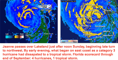 This just in (9/29), from Richard Barwell, of pier after Jeanne. He's working off his laptop and using a phone modem to get us these images. We'll have more photos up in about a week. Thanks Richard! (clik on image for larger view) September 27, 2004: Back on line after a couple of days without power, but nothing compared to what the rest of the state is feeling. Talked with Susan Barwell Sunday afternoon, after the worst had passed for the east coast and Jeanne was plowing through the Lakeland region. She and Richard both ok, but others up and down the coast took, yet again, a beating. Although able to log on using the hard phone line and the laptop, internet activities were kept to a minimum to conserve battery and frankly, it was hot, humid, and typing on a laptop keyboard by candlelight seems counterproductive. For many on the east coast and in central Florida, the miseryjust keeps getting worse. Aid is bandaid variety in many instances, and the sheer scope of physical alteration to the environment is staggering. Many original victims of Charley are still living in a twilight zone of subsistence, while the Panhandle continues to dig out. Any good news? Fall's in the air, although when the temp still hits 90, that may be a relative season. Here's a big thanks to the power company deal makers who sold out critical line maintenance to inflate profits, resulting in needless emergency work for harried crews and unnecessary outages for thousands who otherwise wouldn't have lost service, compounding the problems for legitimate storm damage. Because of intentional cutbacks in tree trimming over the years, thousands of victims who remain in desperate need of lines and poles have to wait as crews rotate throughout the state; now, linemen from as far as California and Nevada are helping restore power throughout the state. Oh, same thanks also to the patronizing politicians who swapped votes for campaign funds instead of looking out for their constituents, telling everyone that competition is good for all things Florida, especially when it's based on critical need infrastructure. (We have an issue pending for our phone service, thanks to a legislature who's motto is, “Top Bidder Takes The Session.”) Is anyone out there still seriously considering the complete privatization of utilities as a bonus for the citizens? Maybe they can get Ken Lay as the new state utilities regulator. After he's done with his community service, that is. September 25, 2004: One week after Ivan took out the Panhandle, three weeks after Frances soaked the state, and just over a month since Charley destroyed Punta Gorda, now comes Jeanne storming back ashore like some weird zombie weather nightmare; The Day of the Living Hurricanes. Oooh, yuck! Over three million have been ordered to evacuate — again, and major airports in Orlando and Tampa will also be shutting down — again. You may remember a couple of weeks ago. Jeanne formed right after Ivan and proceeded to rain all over the Carib, then wandered up into the Atlantic. Since then it's reformed into a Cat 3 storm forecast to come ashore during the night and proceed up through central Florida throughout Sunday. 2:30 p.m. Just talked with Susan Barwell to get an update on the Brevard situation. Susan and Richard live on the top floor of their five-story Cocoa Beach condo, a block and a half from Ron Jon's on the Bannana River side, and Susan says the river's already getting whipped up in a heavy chop. Though in a mandatory evac zone, they're staying, and were busy shutting down the condo elevators and otherwise preparing for the next 24-hours. We'll talk tomorrow for an update on the latest round in a season that's already affected nearly every facet of the state. Here on the west coast, we're expecting high winds and heavy rain in the early morning hours and throughout the day on Sunday. Since the last couple of blows pretty much caught the power company unprepared in terms of tree trimming, the action's been heavy getting limbs and branches away from overhead lines, so perhaps we won't lose power this time. |