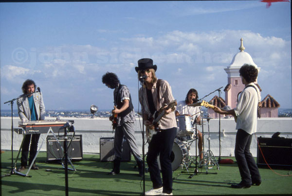 (ST. PETE BEACH, FL) I wasn’t a huge Tom Petty fan in ’85, with the major exception of his trademark hit, "American Girl". I dug it because of it’s track back to Gainesville and the connection to Dubs, spectacular backbeat and of course that whacked out intro. Toss in the slightly out-of-synch harmonies and you’ve got an instant classic. When the call came a few days earlier to shoot a gig at the Don CeSar I thought, "Yeah, ok, no big deal." In all the years before and since, I’d only been there once — to shoot a friend’s wedding (his third but not last) just the month before. Bulldozing The Show The deal was, Tom had broken his famous hand a few months before and this was ostensibly the first time since his surgery anyone would have any idea of whether or not he’d still be able to play. Hard to believe now, but before round-the-clock cable blabbermouths hooked mostly on self-adoration and stupidity, it was possible to embargo news to either prevent or spur speculation. So there I was to record the moment of truth, shooting stock for LGI on a referral from Tampa ASMP buddy and ace studio shooter Terry Drymon. (Terry had an infamous collection of model’s other lips on the wall of his studio dressing room. First timers couldn’t quite figure out how the lipstick on cocktail napkin impressions were created.) Me and MTV in full music video production mode, which obviously was a huge clue if you were wondering whether or not there was any doubt Tom still had a career. I wasn’t that sharp. The Way It Was, Then Neither were there personal computers, damn few "cell" phones, and fax machines were a status symbol that weighed a ton and cost a fortune. Photoshoots were covered the old-fashioned way: load up on film, make sure you had backup metering, check your "automatic" lenses to make sure they would, in fact, stop down to the set aperture when the shutter banged across and then reopen, load everything up and haul the assorted luggage around, through, up and down whatever obstacles popped up. What I remember is, as metering — first analog, then digital — became more precise, so to did the fanatic obsessive-compulsive behavior to constantly check the reflected light. Not like anything would be changing if, for instance, the assignment would take place on a penthouse patio underneath a brilliant and beautiful beachy Florida spring day. Lets just say for the sake of discussion we’d be shooting Ektachrome 200, which in this instance would come out to something around f8-11 at 1/500th. More or less, with no bounce off the Astroturf, as it was then referred to, covering the patio. Say, You With the Band? Duh! There wasn’t any pretense about the group. The atmosphere was relaxed, the mood laid back, and I was silently praying to the Kodak gods that my putting off overdue lens overhauls wouldn’t catch up with me today. Please, let me capture something worth smiling about. We mostly waited while the video crew finished laying track and setting lights. When they were satisfied, the band and one out-of-water photographer headed out onto the patio and in the next few moments I was introduced to the difference between top of their game professional musicians and club bands playing covers. Bang! Straight into "American Girl" and immediately everyone was grinning like Santa came early and the tooth fairy left Travelers Cheques. One word describes the sound — tight. Yeah, these guys really are that good.